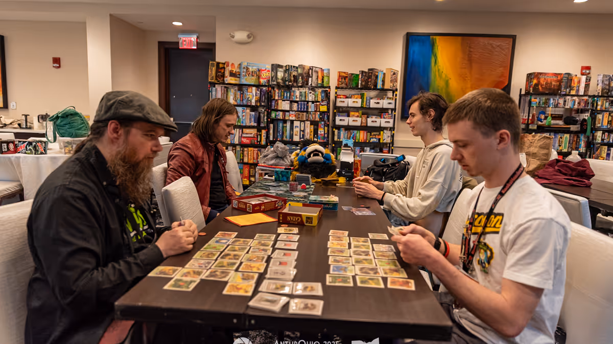 To raise the funds to cover their travel expenses for future AnthrOhio conventions and the maintenance of their Lending Library, Pawns’ Gamebag has a Sales Counter offering games, playmats, MTG Singles, and custom printed buttons.